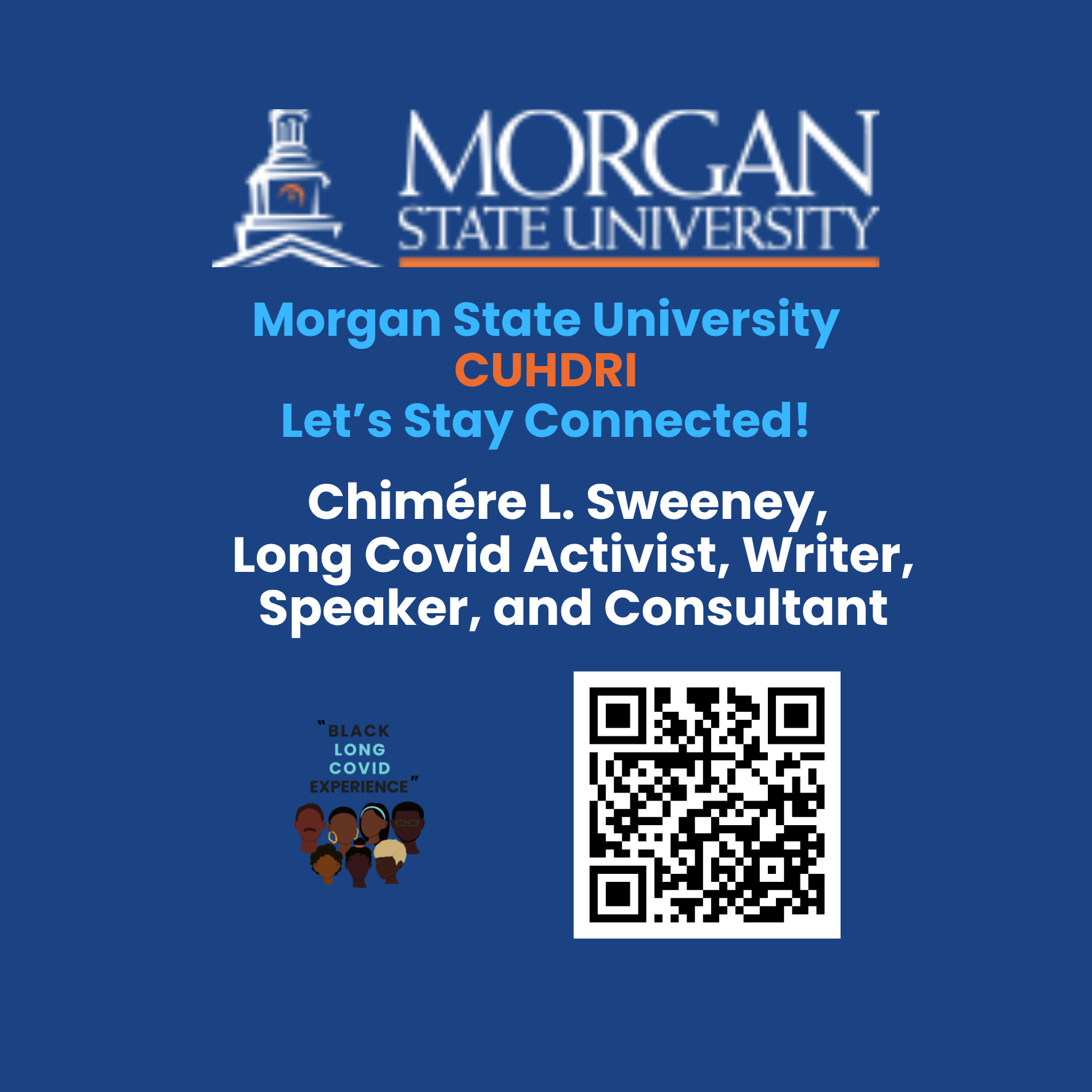 As a disabled activist and Director of The Black Long Covid Experience, Chimére L. Sweeney draws from her own journey with Long Covid, advocating for equitable medical care and policy change. As a retired Maryland teacher, she deeply connects with Black urban communities and understands their distinct health needs.